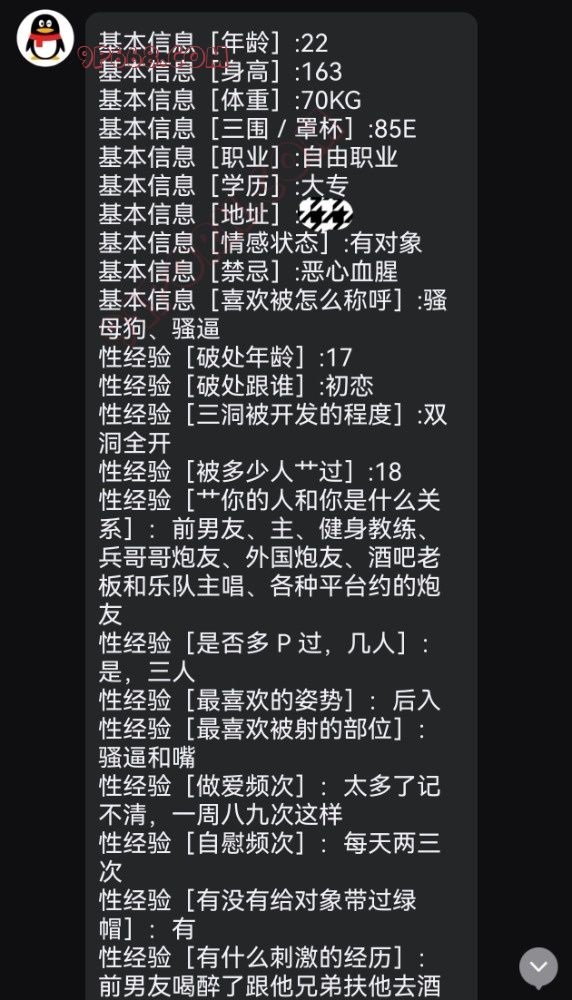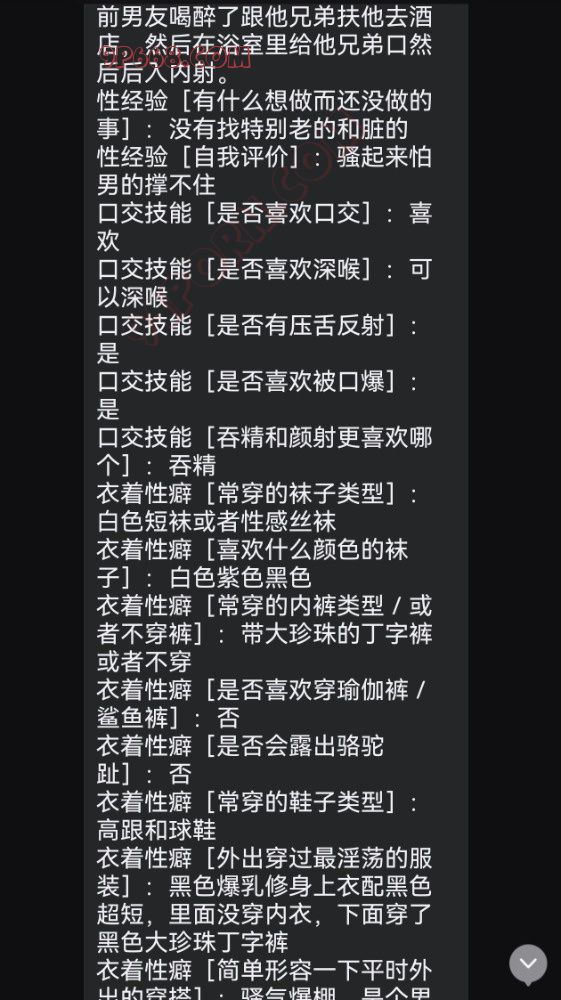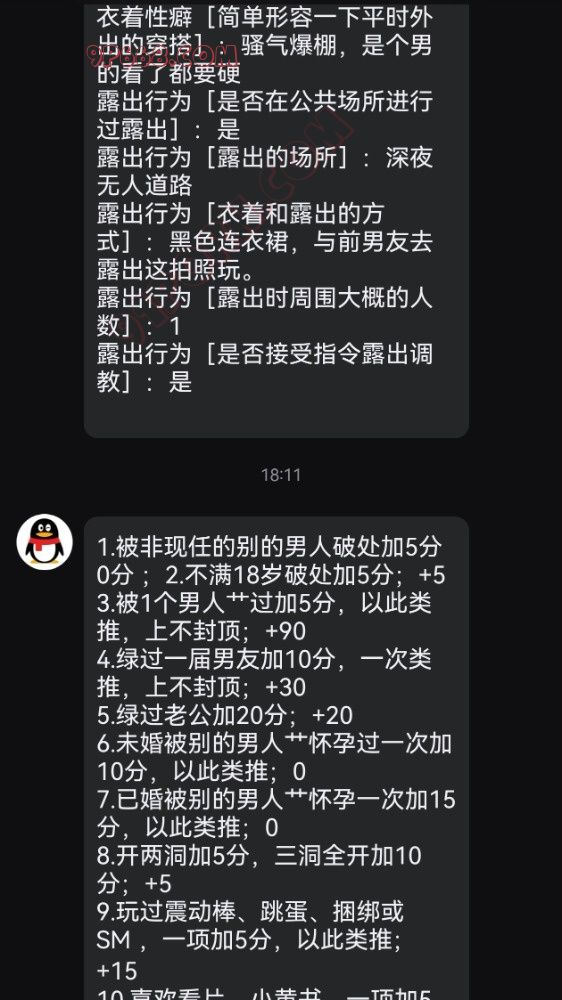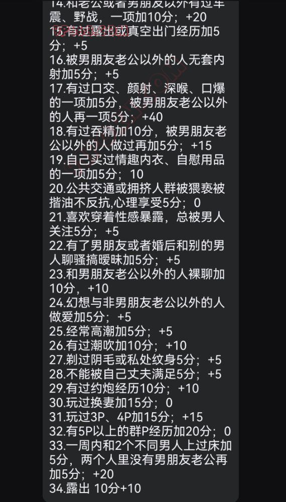 基本信息[年龄]:基本信息[身高]: 基本信息[体重]: 基本信息[三围/罩杯]: 基本信息[职业]: 基本信息[学历]: 基本信息[地址]: 基本信息[情感状态]: 基本信息[禁忌]: 基本信息[喜欢被怎么称呼]: 性经验[破处年龄]: 性经验[破处跟谁]: 性经验[三洞被开发的程度]: 性经验[被多少人艹过]: 性经验[艹你的人和你是什么关系]: 性经验[是否多 P 过,几人]: 性经验[最喜欢的姿势]: 性经验[最喜欢被射的部位]: 性经验[做爱频次]: 性经验[自慰频次]: 性经验[有没有给对象带过绿帽]: 性经验[有什么刺激的经历]: 性经验[有什么想做而还没做的事]: 性经验[自我评价]: 口交技能[是否喜欢口交]: 口交技能[是否喜欢深喉]: 口交技能[是否有压舌反射]: 口交技能[是否喜欢被口爆]: 口交技能[吞精和颜射更喜欢哪个]: 衣着性癖[常穿的袜子类型]: 衣着性癖[喜欢什么颜色的袜子]: 衣着性癖[常穿的内裤类型/或者不穿内裤]: 衣着性癖[是否喜欢穿瑜伽裤/鲨鱼裤]: 衣着性癖[是否会露出骆驼趾]: 衣着性癖[常穿的鞋子类型]: 衣着性癖[外出穿过最淫荡的服装]: 衣着性癖[简单形容一下平时外出的穿搭]: 露出行为[是否在公共场所进行过露出]: 露出行为[露出的场所]: 露出行为[衣着和露出的方式]: 露出行为[露出时周围大概的人数]: 露出行为[是否接受指令露出调教]: 1.被非现任的别的男人破处加5分 ;2.不满18岁破处加5分; 3.被1个男人艹过加5分,以此类推,上不封顶; 4.绿过一届男友加10分,一次类推,上不封顶; 5.绿过老公加20分; 6.未婚被别的男人艹怀孕过一次加10分,以此类推; 7.已婚被别的男人艹怀孕一次加15分,以此类推; 8.开两洞加5分,三洞全开加10分; 9.玩过震动棒、跳蛋、捆绑或 SM ,一项加5分,以此类推; 10.喜欢看片、小黄书,一项加5分,以此类推 11.拍不露脸裸照、视频发给男朋友老公以外的男人,一项加5分,以此类推; 12.拍露脸裸照、视频发给男朋友老公以外的男人,一项加10分,以此类推; 13.和老公或者男朋友有过车震、野战,一项加5分 14.和老公或者男朋友以外有过车震、野战,一项加10分; 15.有过露出或真空出门经历加5分; 16.被男朋友老公以外的人无套内射加5分; 17.有过口交、颜射、深喉、口爆的一项加5分,被男朋友老公以外的人再一项5分; 18.有过吞精加10分,被男朋友老公以外的人做过再加5分; 19.自己买过情趣内衣、自慰用品的一项加5分; 20.公共交通或拥挤人群被猥亵被揩油不反抗,心理享受5分; 21.喜欢穿着性感暴露,总被男人关注5分; 22.有了男朋友或者婚后和别的男人聊骚搞暧昧加5分; 23.和男朋友老公以外的人裸聊加10分, 24.幻想与非男朋友老公以外的人做爱加5分; 25.经常高潮加5分; 26.有过潮吹加10分; 27.剃过阴毛或私处纹身5分; 28.不能被自己丈夫满足5分; 29.有过约炮经历10分; 30.玩过换妻加15分; 31.玩过3P、4P加15分; 32.有5P以上的群P经历加20分; 33.一周内和2个不同男人上过床加5分,两个人里没有男朋友老公再加5分; 34.露出 10分 需要问卷的兄弟自取,不用加我。 欢迎投稿。